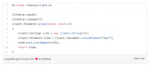 As an experimental prototype of anyref support, we decided to only allow classes defined in the special client namespace to be used in WebAssembly functions: these classes have no layout on the C++ side, only methods. Special methods starting with set_ and get_ are compiled to accesses to the corresponding member fields of the object. Classes declared in this namespace can model existing objects coming from the JavaScript outside of Cheerp, like the native web APIs or a third party JavaScript library.